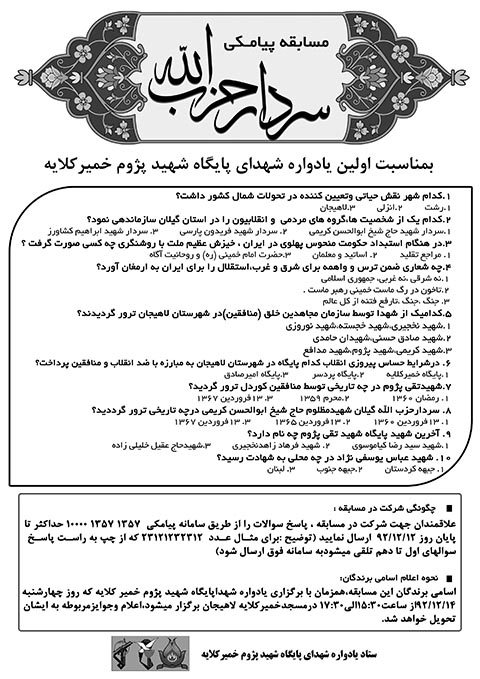 ستاد یادواره شهدای پایگاه شهید پژوم خمیرکلایه لاهیجان همزمان با این یادواره، مسابقه پیامکی سردار حزب الله را نیز برگزار میکند.