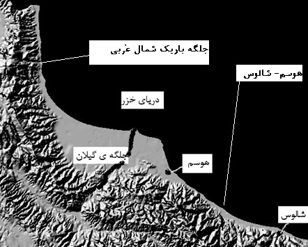 نقشه ی 1 . در این نقشه سه بعدی، محدوده ی جلگه ی گیلان یعنی ناحیه ای که ارتفاع آن ازسطح دریاهای آزاد حدوداً کمتر از 150 متر است به صورت مسطح نمایانده شده است. چنان که پیداست این ناحیه در تمام نوار ساحلی دریای خزر با پهنای متفاوت دیده می شود و از این رو توان های متفاوتی برای کشاورزی و تولید خوراک در سپیده دم تاریخ عرضه می کرد. جلگه ی گیلان در شمال غربی و غرب تنها باریکه ای به عرض حدود 5 کیلومتر است اما در بخش جنوب مرداب انزلی و در حوزه آبریز این مرداب ، پهن ترین بخش جلگه پدید می آید..در شرق رودخانه ی سفیدرود یعنی دشت شرقی گیلان نیز به طور قابل ملاحظه ای جلگه هنوز پهن است لیکن از هوسم یا رودسر امروزی تا چالوس یا شالوس دوباره به مانند ناحیه ی باریک غرب و شمال غربی به نواری کم عرض تبدیل می شود. اما در جنوب شرقی رودسر یعنی در جایی که دلتای رودخانه ی پلرود تشکیل می شود این جلگه اندکی پهن تر می شود. لازم است به تاکید یادآوری کنیم که تنها ناحیه ی جلگه ای گیلان بوده است که استعداد کشت و کشاورزی و تولید خوراک در آن بستر پیدایش یکجانشینی و تمدن حضَری در تاریخ گیلان فراهم کرده است. مناطق کوهستانی و حتا دره های باریک موجود در آن به دلیل فقدان سیلاب دشت های پهناور، فاقد چنین توان و ظرفیتی بوده است. بنابراین جلگه ی گیلان بود که منحصراً شایستگی پیدایش تمدن حضری و تاریخ یکجانشینی و شهر در این منطقه را به خود اختصاص داده است.