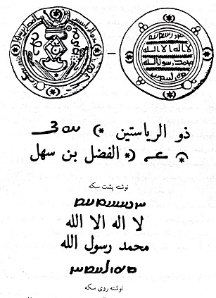 تصویر 2 . دو روی سکه ی مربوط به فضل بن سهل ملقب به ذوالریاستین که در سال197هجری قمری درطبرستان ضرب و به دو خط پهلوی ساسانی و خط کوفی عربی نوشته شده است(ماخذ: علی اکبر سرفراز و همکار، کتاب سکه های ایران،1387 انتشارات سمت)