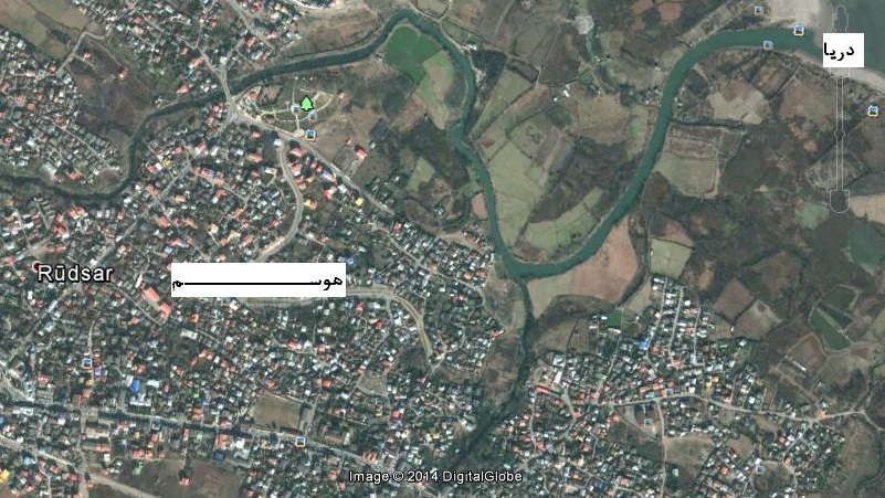 تصویر 3. موقعیت هوسم(رودسر بعدی) در میان دو رود و دسترسی مناسب به دریا برای ایجاد بندرگاه. به نظر می رسد که نام رودسر از اتصال همین دو رود در مصب این رودخانه ها به هم و موقعیت قرارگیری شهر در میان آن ها باشد. احتمالا بخشی از زمین های اطراف رودخانه ای که از به هم پیوستن دو رود تشکیل شده و به دریا می ریزد و زمین های آن امروزه بین شهر رودسر و دریا واقع شده در هزار سال اخیر از آب خارج شده است.تصویر از گوگل ارت به تاریخ 16/11/1391